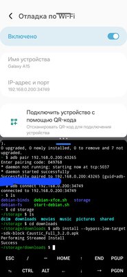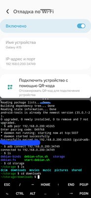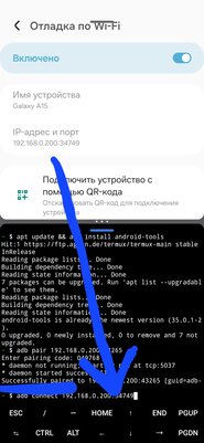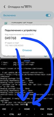 5. Из появившегося окошка нам нужны ip-адрес с портом и код подключения. Вписываем их в команды в термуксе: adb pair 192.168.0.200:43265 затем вписываем код в открывшуюся строку