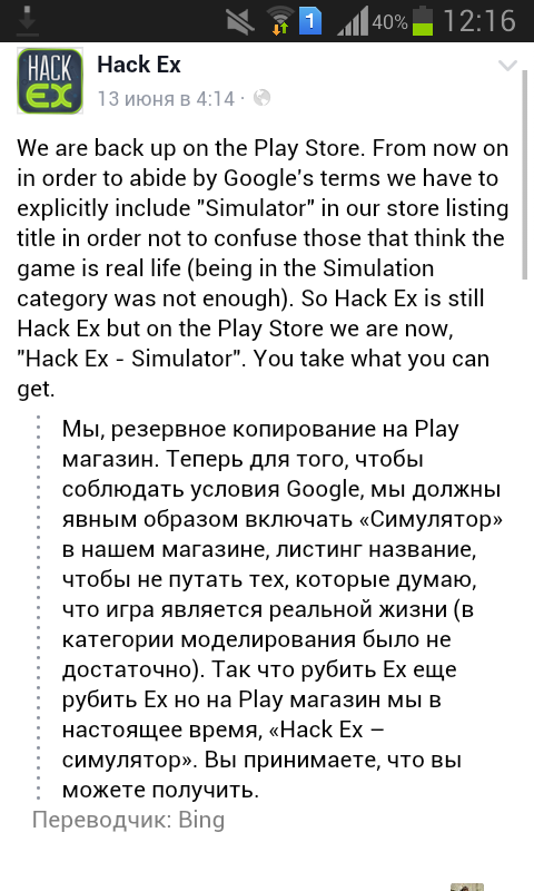 Мы, резервное копирование на Play магазин. Теперь для того, чтобы соблюдать условия Google, мы должны явным образом включать «Симулятор» в нашем магазине, листинг название, чтобы не путать тех, которые думаю, что игра является реальной жизни (в категории моделирования было не достаточно). Так что рубить Ex еще рубить Ex но на Play магазин мы в настоящее время, «Hack Ex – симулятор». Вы принимаете, что вы можете получить. Переводчик: Bing