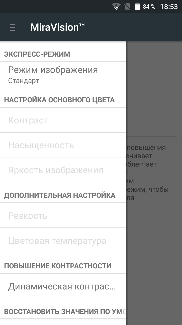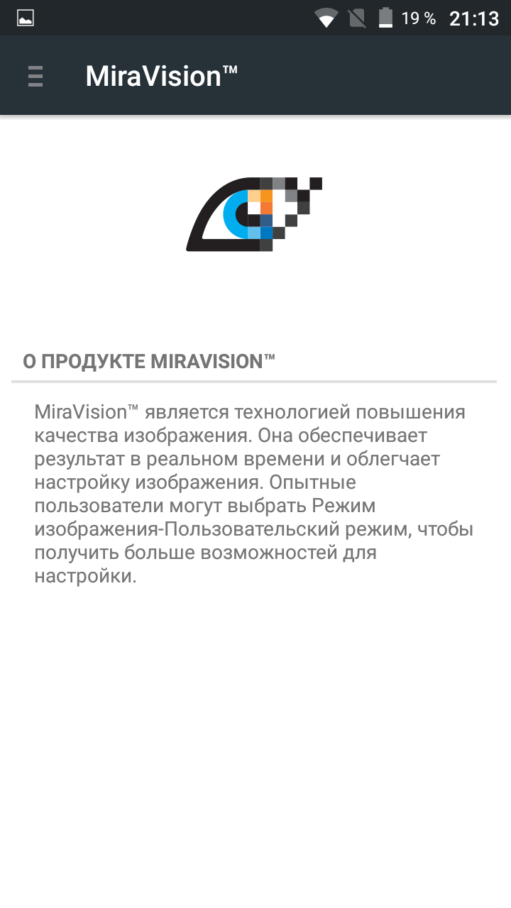 Miravision – технология, реализованная на базе процессоров MediaTek и направленная на улучшение пользовательского опыта во время пользования дисплеем устройства путем подстройки основных и дополнительных параметров изображения под индивидуальные нужды покупателя. Эта функция позволяет увеличить четкость картинки и плавность смены кадров во время просмотра видео, усилить яркость и контрастность экрана для удобного пользования в любых окружающих условиях. Всё настраивается в реальном времени, что очень удобно.