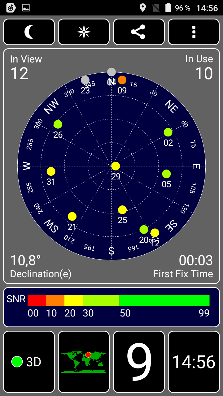 Модуль GPS работает на уровне ценовой категории смартфона. За 3 секунды в поле видимости попало 12 спутников, 10 из которых отслеживали движение.
