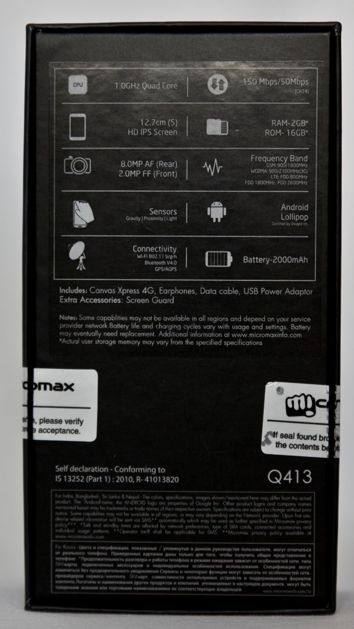 Упаковка Micromax Canvas Express 4G привлекает стильным дизайном – небольшая картонная коробка матово-черного цвета с серыми логотипом и названием устройства. Ярко выделяющееся и концентрирующее на себе внимание единственное цветное изображение – фотография самого смартфона, демонстрирующая его основные внешние характеристики: переднюю и заднюю панели, разъемы, камеру.