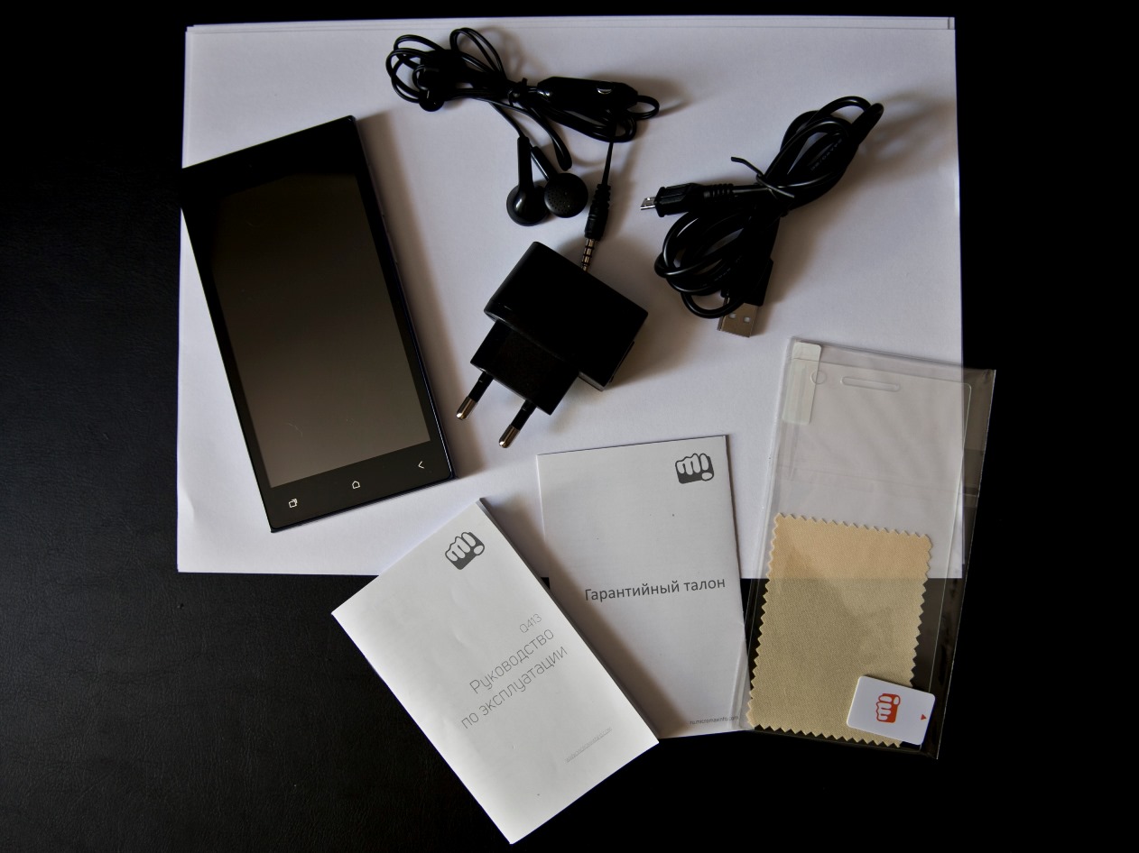 Внутри упаковки, кроме смартфона, лежат зарядное устройство 5V 1A, кабель micro-USB длиной 1,2м для подключения к ПК, гарантийный талон, руководство по эксплуатации, листок с информацией о сертификации продукции, а также хлипкие наушники-гарнитура и приятное дополнение, которое часто не комплектуется со многими, даже дорогими, девайсами – защитная пленка на экран и набор для её наклеивания.
