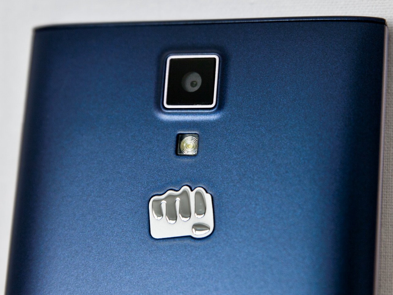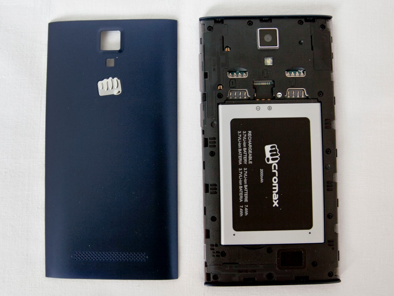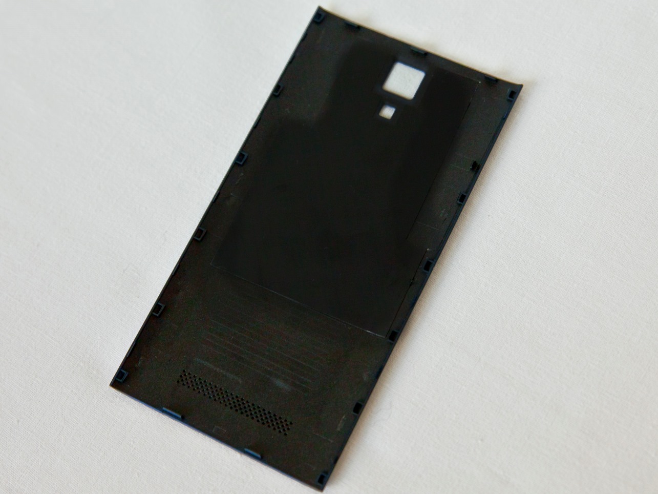 На задней крышке нанесен логотип Micromax, проделаны отверстия для камеры и вспышки, и нанесена перфорация для динамика. На внутренней стороне наклеен уплотнитель.