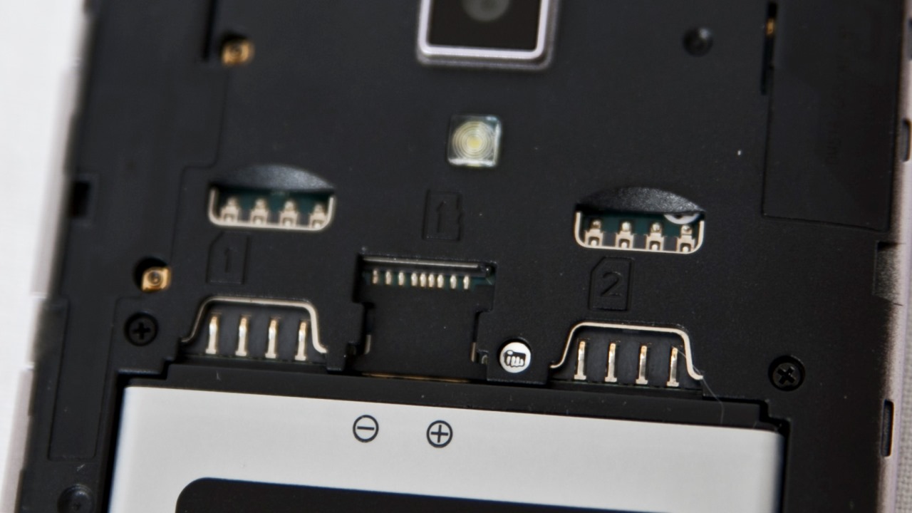 Сняв заднюю панель, покупатель сможет насладиться видом на аккумуляторную батарею, квадратные камеру и вспышку, динамик, два слота microSIM и слот для карты памяти microSD. Быстро и удобно вставлять и вытаскивать карты не получится — чтобы их установить, нужно вытащить аккумулятор.