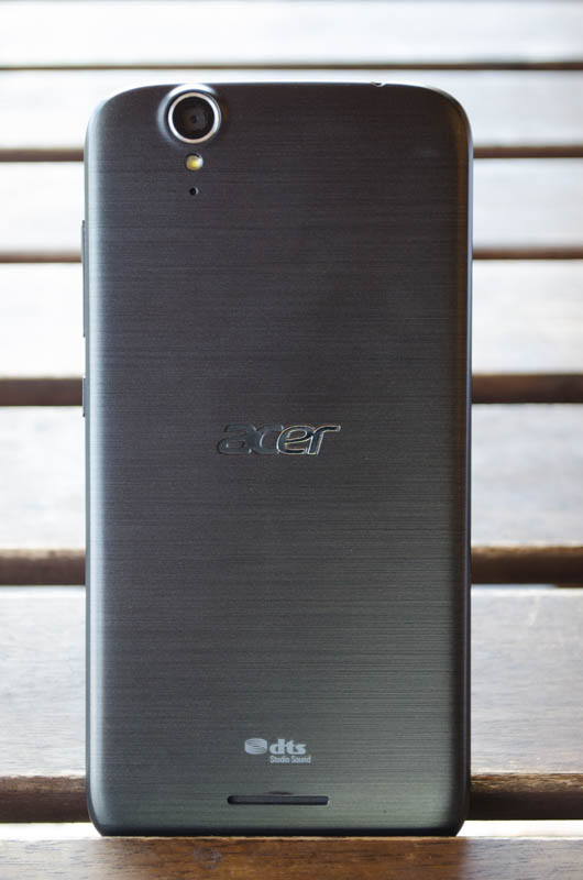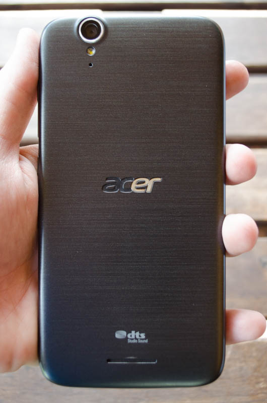 ACER Liquid Z630 обладает пластиковым корпусом со съемной задней панелью, которую будто бы долго терли крупным наждаком. Лаконичный экстерьер устройства оживляет серебристый кружок динамика, который гармонирует с логотипом производителя на фронтальной панели. В верхней ее части имеется светодиодный индикатор событий. Еще одна интересная дизайнерская находка — сужающаяся полоска на торцах, визуально искажающая геометрию корпуса.