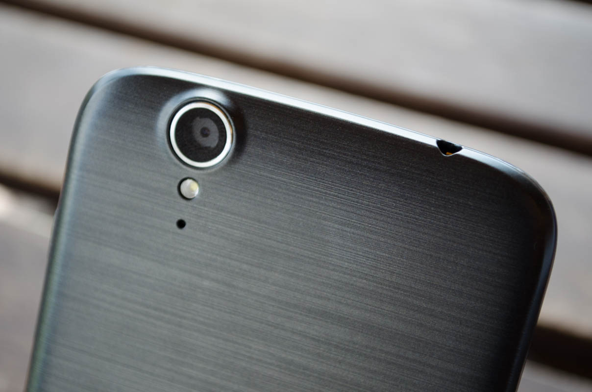 Центральное место на задней панели занимает еще один логотип производителя. Металлизированная фольга, из которой он сделан, судя по отзывам, часто отклеивается, что и произошло в случае с тестовым образцом. Отметим большой окуляр камеры, сквозь который можно увидеть фотографический сенсор чуть ли не целиком. Также конструкцией предусмотрены: однотоновая вспышка и дополнительный микрофон системы шумоподавления.