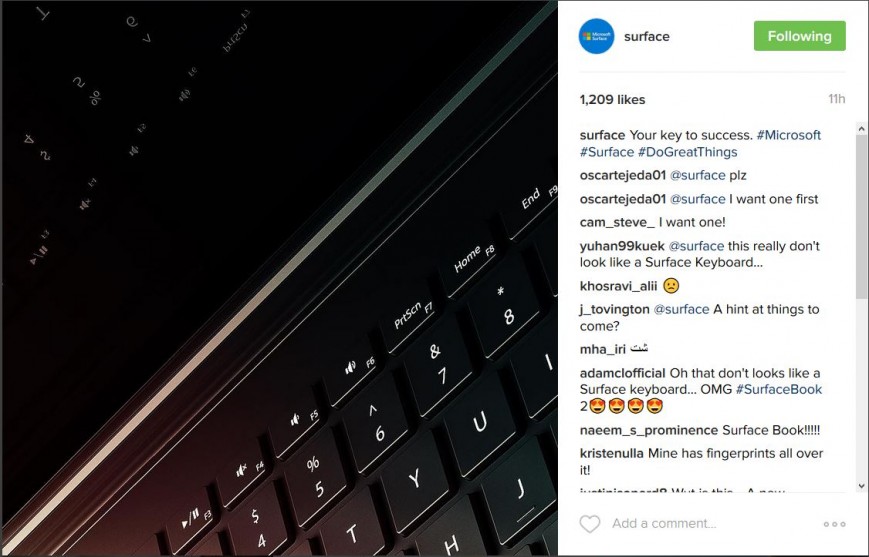 Подпись к фото в Instagram* гласит «Ваш ключ к успеху». Это означает, что новый ноутбук компании также будет ориентирован на корпоративный рынок. Помимо этого, можно заметить новый механизм поворота дисплея. Благодаря ему экран Surface Book 2 будет плотно прилегать к клавиатуре. Корпус ноутбука на фото выполнен в черном цвете, в то время как прошлое поколение Surface Book продавалось лишь в серебристом цвете.