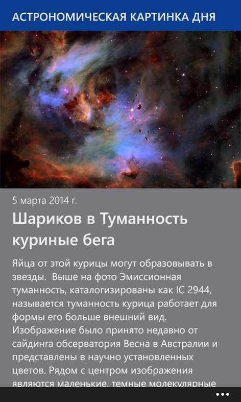 Каждый день новое изображение нашей потрясающей Вселенной в приложении, и на экране блокировки, если вы выбираете, вместе с кратким пояснением от профессионального астронома. Вы также можете сохранить фотографию на свой телефон с помощью крана и проведение на картинке.