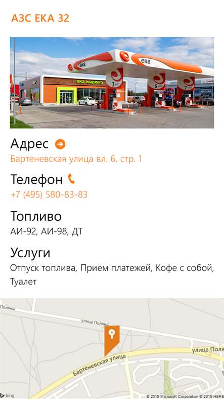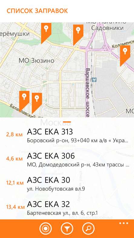 Позволяет с легкостью найти ближайшую АЗС ЕКА и проложить до нее маршрут, а также получить подробную информацию об адресах, контактных данных, типах топлива и услугах, реализуемых на всей сети АЗС ЕКА. В приложении реализовано использование гибких фильтров для поиска подходящей Вам заправочной станции по заданным критериям (тип топлива, оказываемые услуги).