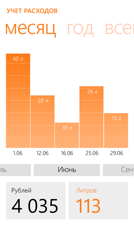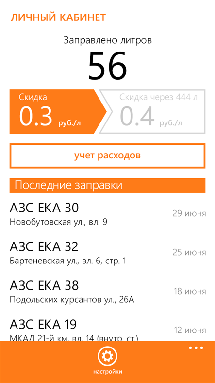 Предоставляет возможность учета и анализа Ваших расходов на топливо. Открывает полный доступ к информации по Вашей дисконтной карте (имеющаяся скидка, количество заправленных литров, дата и место осуществления заправки).