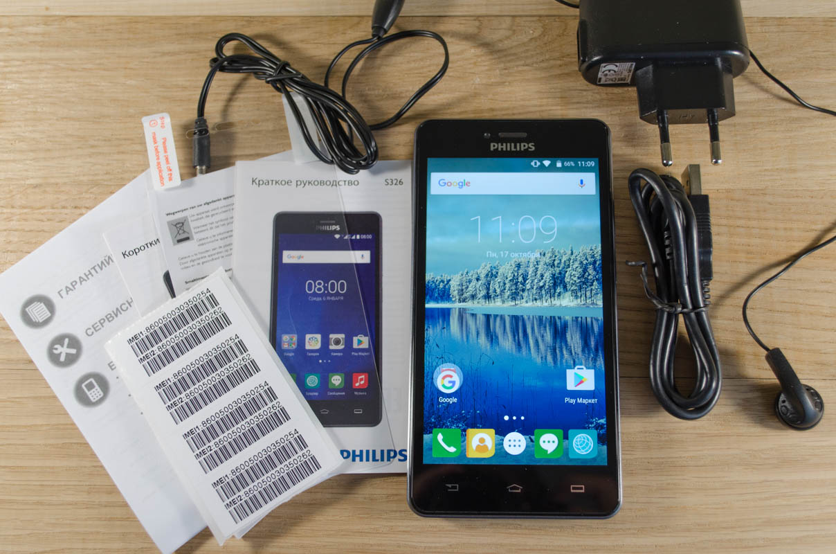 Упаковка Philips S326, что не характерно для ценовой категории, симпатичная и продуманная. Цветной рукав охватывает белую коробку, состоящую из разъемных половинок. Ее внутреннее пространство разделено на отсеки для зарядки (5V 1A), USB кабеля и проводной гарнитуры. В отдельный конверт спрятаны документация и защитная пленка для дисплея.