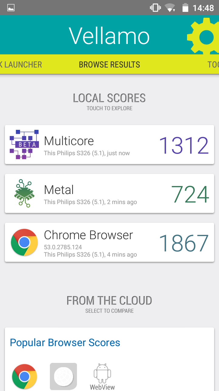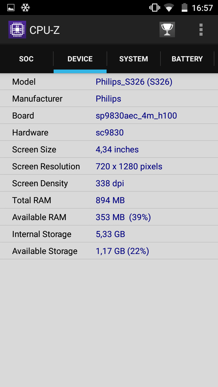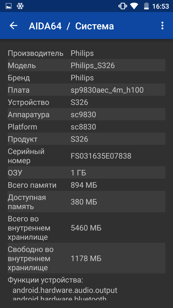 Модель, фигурирующая в линейке под номером SC9830, имеет 4 ядра Cortex-A7 частотой 1.5 ГГц и графическую подсистему Mali-400 MP. Ее вычислительные возможности не впечатляющие, но, в все же, достаточные для неспешного выполнения многих задач, которые пользователь может возложить на Philips S326. А вот объемы памяти, как оперативной — 1 ГБ, так и встроенной — 8 ГБ, из которых под пользовательские нужды доступно лишь 5 с половиной, явно недостаточны. Приложения, лучше перенести на microSD. Отдельный слот поддерживает карты памяти объемом до 32 ГБ.
