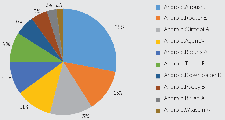 Наибольшее количество вредоносных программ на Android зафиксировано в третьем квартале этого года. Среди них самыми распространенными стали рекламные вирусы семейства Android.Airpush.H. На втором месте этого списка находятся программы, которые получают права суперпользователя без ведома пользователя. В дальнейшем злоумышленники используют доступ к корневому разделу в мошеннических целях. Удивительно, что эти два семейства вирусов, разделяющие между собой первое и второе место, уменьшились в количестве на 3% и 12% соответственно в сравнении с 2015 годом.