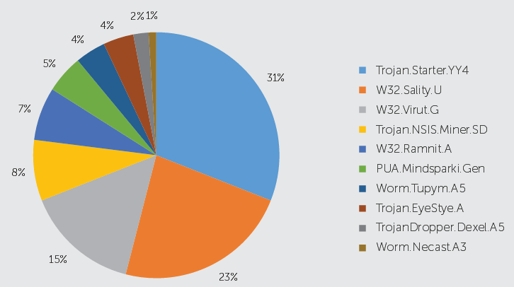Примечательно, что в этом году появилось 4 новых семейства вирусов для Windows, которые сразу же стали самыми распространенными. Вредоносные программы Trojan.Starter.YY4, занявшие первое место в списке самых популярных компьютерных вирусов 2016 года, распространяются через почтовые вложения. При заражении компьютера они скачивают без ведома пользователя зловредное ПО.