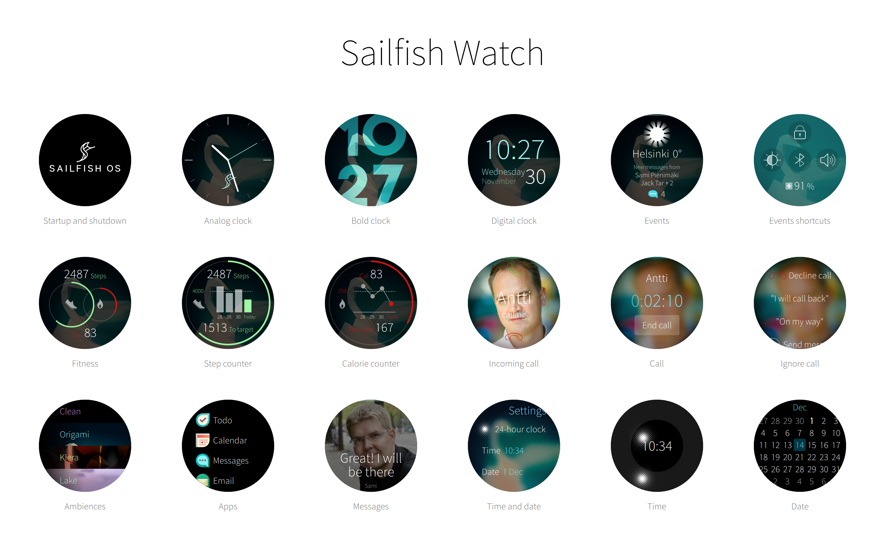 https://youtu.be/Rd86KTs2Les На официальном YouTube-канале Jolla появилось интересное видео, в котором разработчики демонстрируют работу своей Sailfish OS на умных часах. В качестве устройства выбраны одни из популярных часов на Android Wear. Стоит отметить, что Sailfish OS для часов по своему принципу работы очень похожа на ту же Android Wear — все управление осуществляется жестами, а общий язык дизайна практически идентичен. Вот некоторые экраны интерфейса системы (картинка кликабельна):
