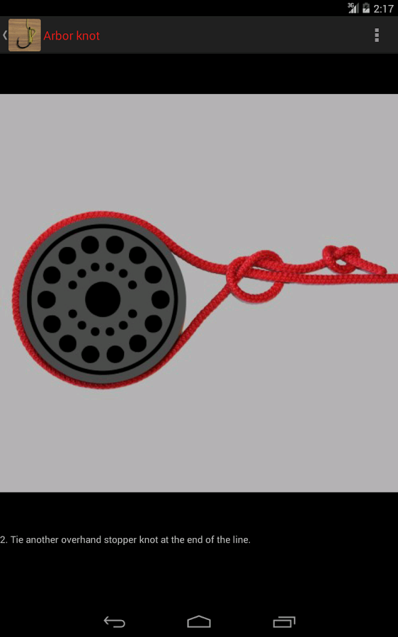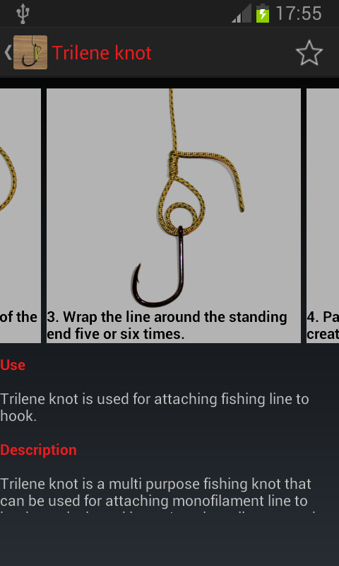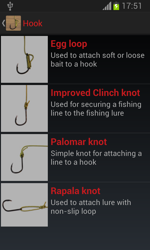 Рыболовные узлы категоризированы типом, и у каждого узла есть описание и пошаговые инструкции с картинами и путеводителем о том, как связать его.