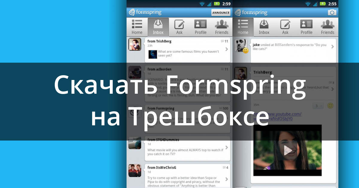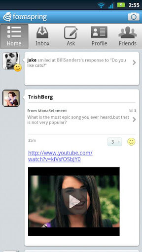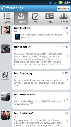 С официальным приложением Formspring для Андроид, вы сможете ответить друзьям на ходу, задать вопросы и поделиться фотографией чтобы из любого места узнать реакцию ваших друзей на все что угодно.