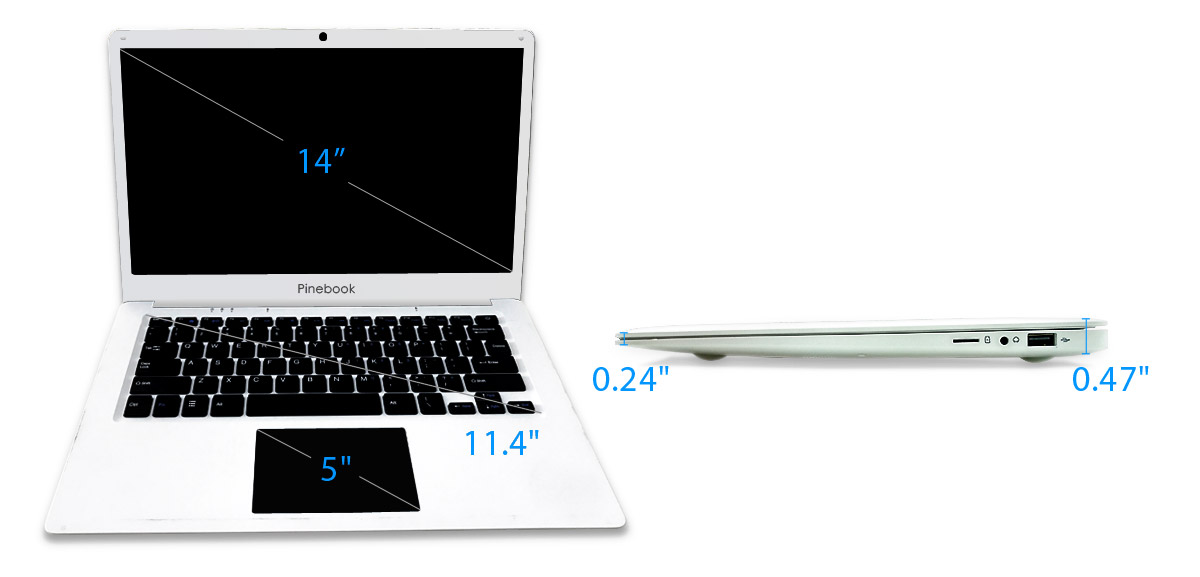 Pinebook также оснащен беспроводными модулями Wi-Fi 802.11b/g/n и Bluetooth 4.0, имеет два порта USB 2.0, разъем для наушников, mini HDMI и веб-камеру на 0,3 мегапикселя. При своих относительно небольших размерах оба ноутбука получили полноразмерные клавиатуры и тачпад с поддержкой мультитач-жестов.