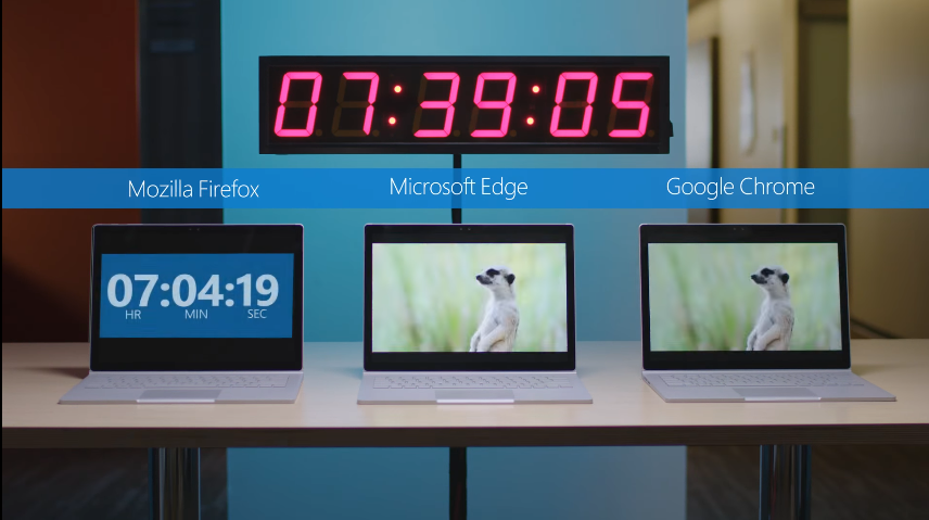 https://youtu.be/2wOz9MuwERs Методика тестирования проста: на трех одинаковых ноутбуках (Microsoft Surface Book) с идентичными версиями Windows 10 запущены три разных браузера — Microsoft Edge (40.15063.0.0), Mozilla Firefox (52.0.1, 32 бит) и Google Chrome (57.0.2987.133, 64 бит); в каждом из них запущено воспроизведение бесконечного видео. По итогам такого тестирования самым прожорливым браузером стал Mozilla Firefox — ноутбук с ним проработал всего 7 часов 4 минуты. На втором месте — Google Chrome с результатом в 9 часов 17 минут. Конечно, в официальном тесте Microsoft не мог не победить фирменный браузер Edge — его экономность позволила ноутбуку проигрывать видео в течение 12 часов 31 минуты.