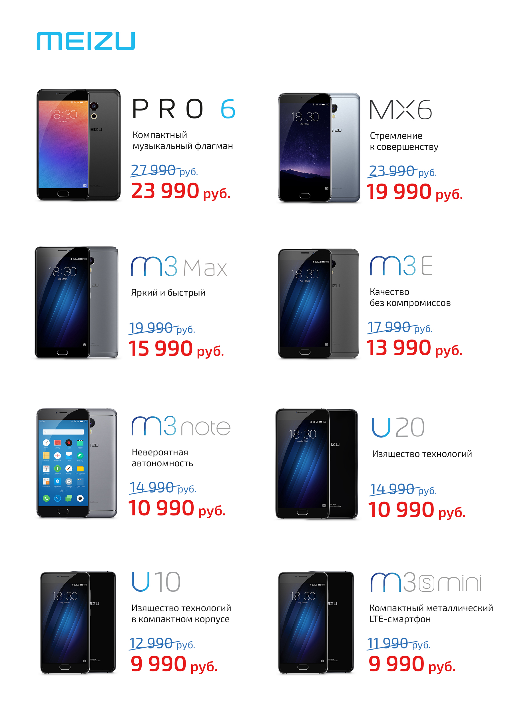 Meizu M3 Max и M3E получили одинаковое снижение — на 4 тыс. рублей. Цена фаблета M3 Max теперь составляет 15 990 рублей, а сбалансированный M3E сто́ит 13 990 рублей. Хитовый Meizu M3 Note с большой батареей на 4 100 мАч получил скидку до 10 990 рублей. Стеклянные Meizu U20 и U10 теперь можно купить за 10 990 и 9 990 рублей соответственно. Бюджетный Meizu M3s mini с металлическим корпусом и поддержкой LTE продается за 9 990 рублей. С чем связан небольшой обвал цен — компания не уточняет. Возможно, на изменение ценовой политики повлияло укрепление курса рубля.