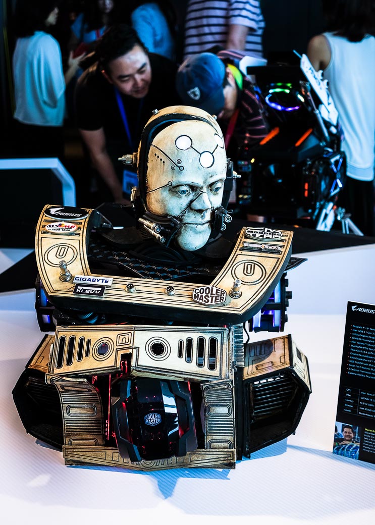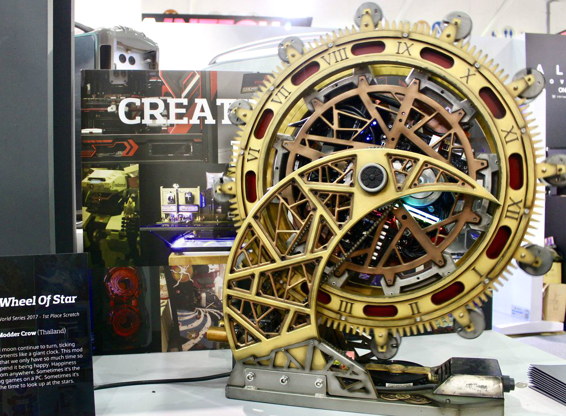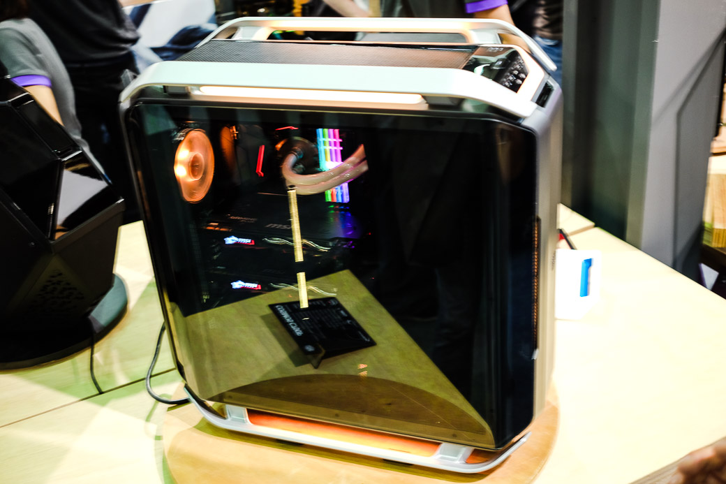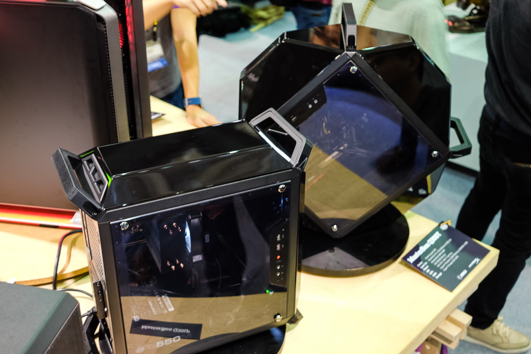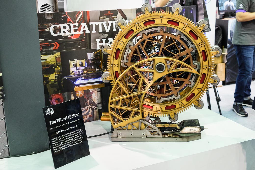 Помимо классических геймерских устройств типа клавиатур, мышей и гарнитур, стенд Cooler Master обратил на себя внимание корпусами для ПК. Одно только вращающееся «Колесо звезды» (The Wheel of Star) в стимпанковском стиле чего стоит — это уникальный выставочный экземпляр, который не стоит ожидать в продаже. Новинка заняла первое место в собственном конкурсе Cooler Master — Case Mode World Series. Также компания продемонстрировала фирменные юбилейные сборки в честь 25-летия — Cosmos 25th Anniversary Edititon, и совершенно новые линейки: MasterCase H500P, Cosmos C700P и MasterBox Q с кубическим дизайном.
