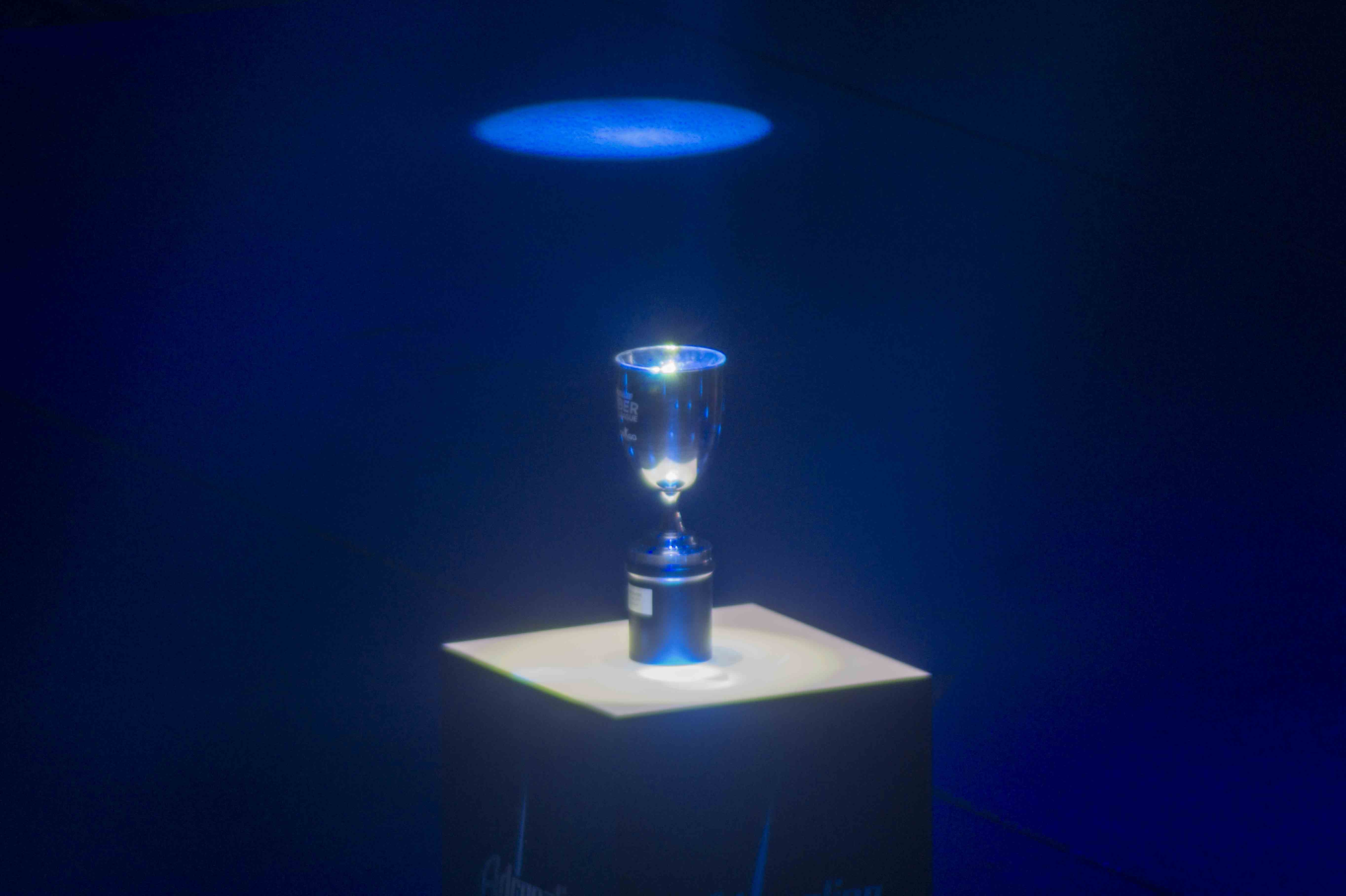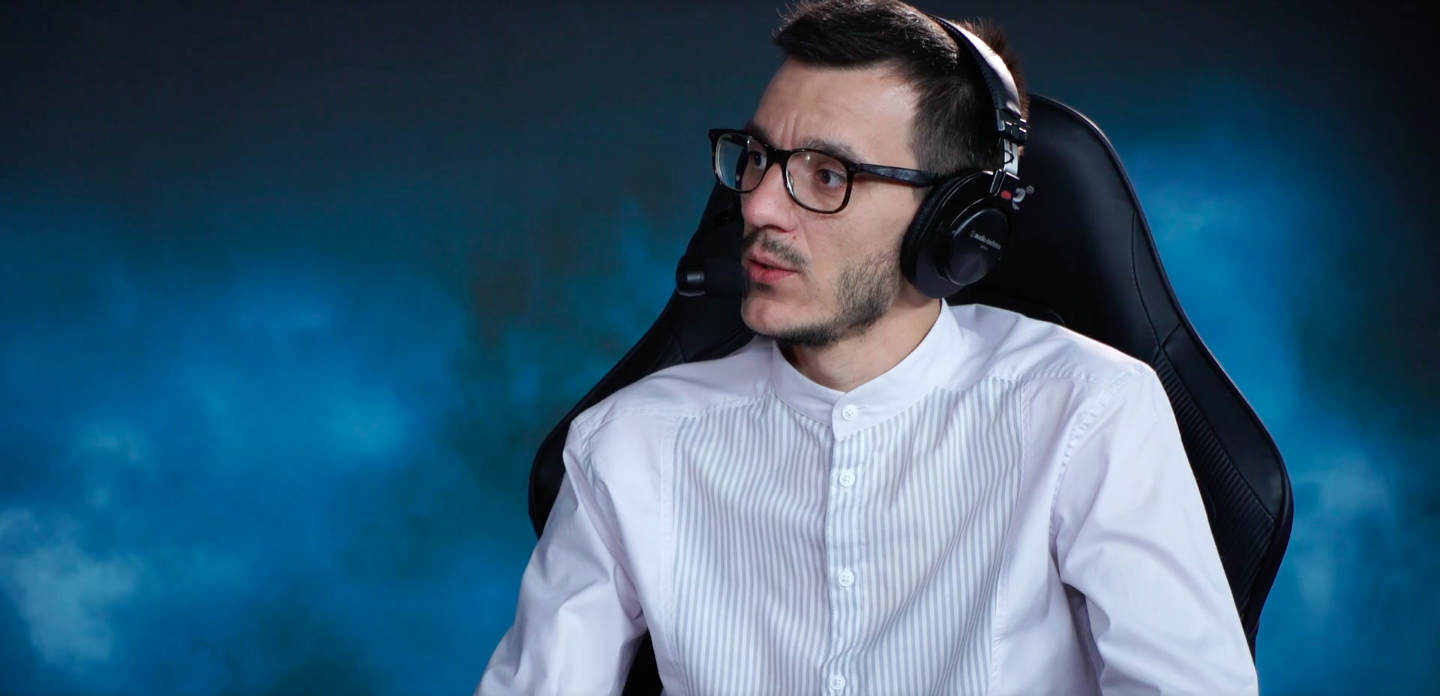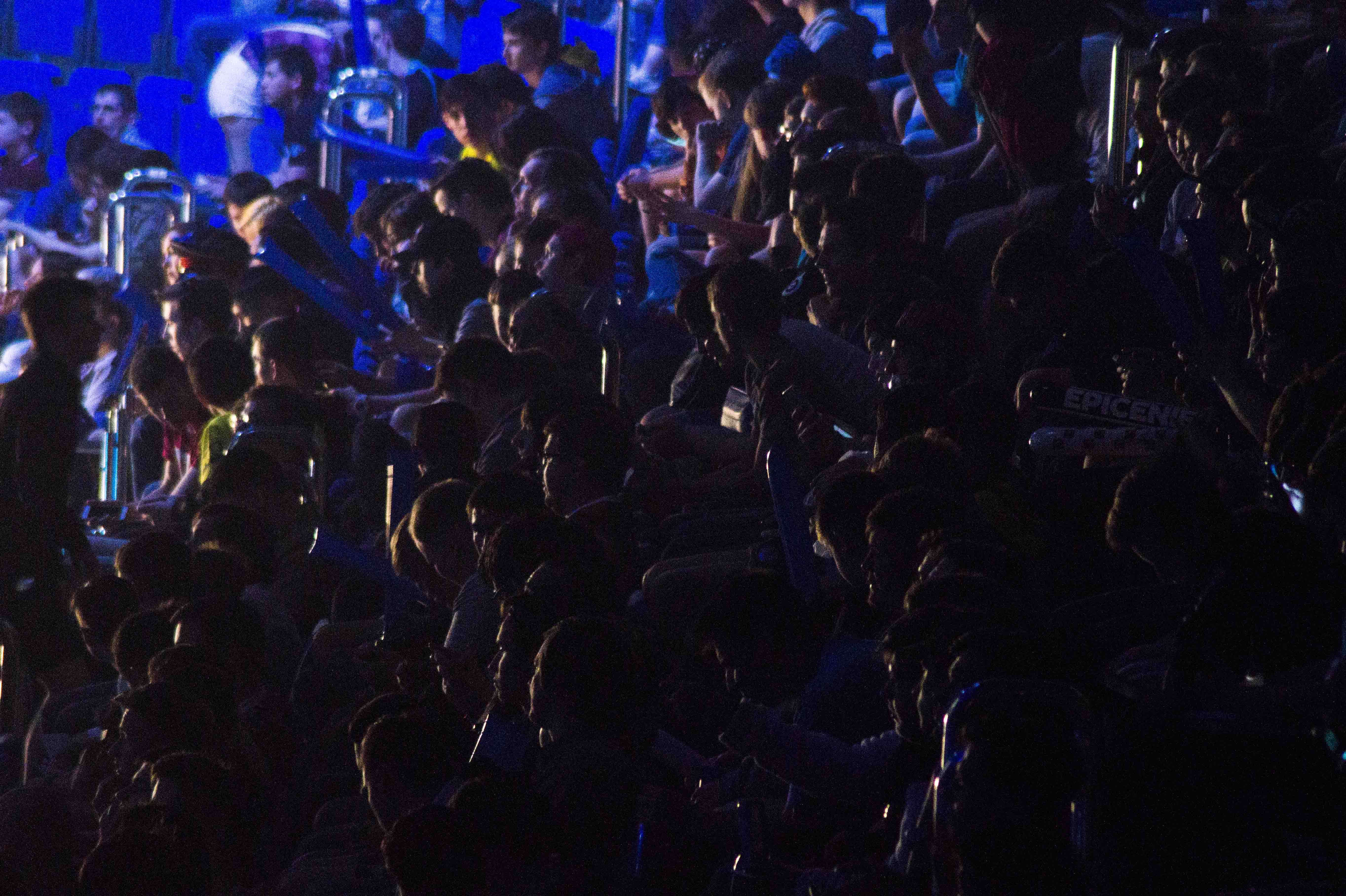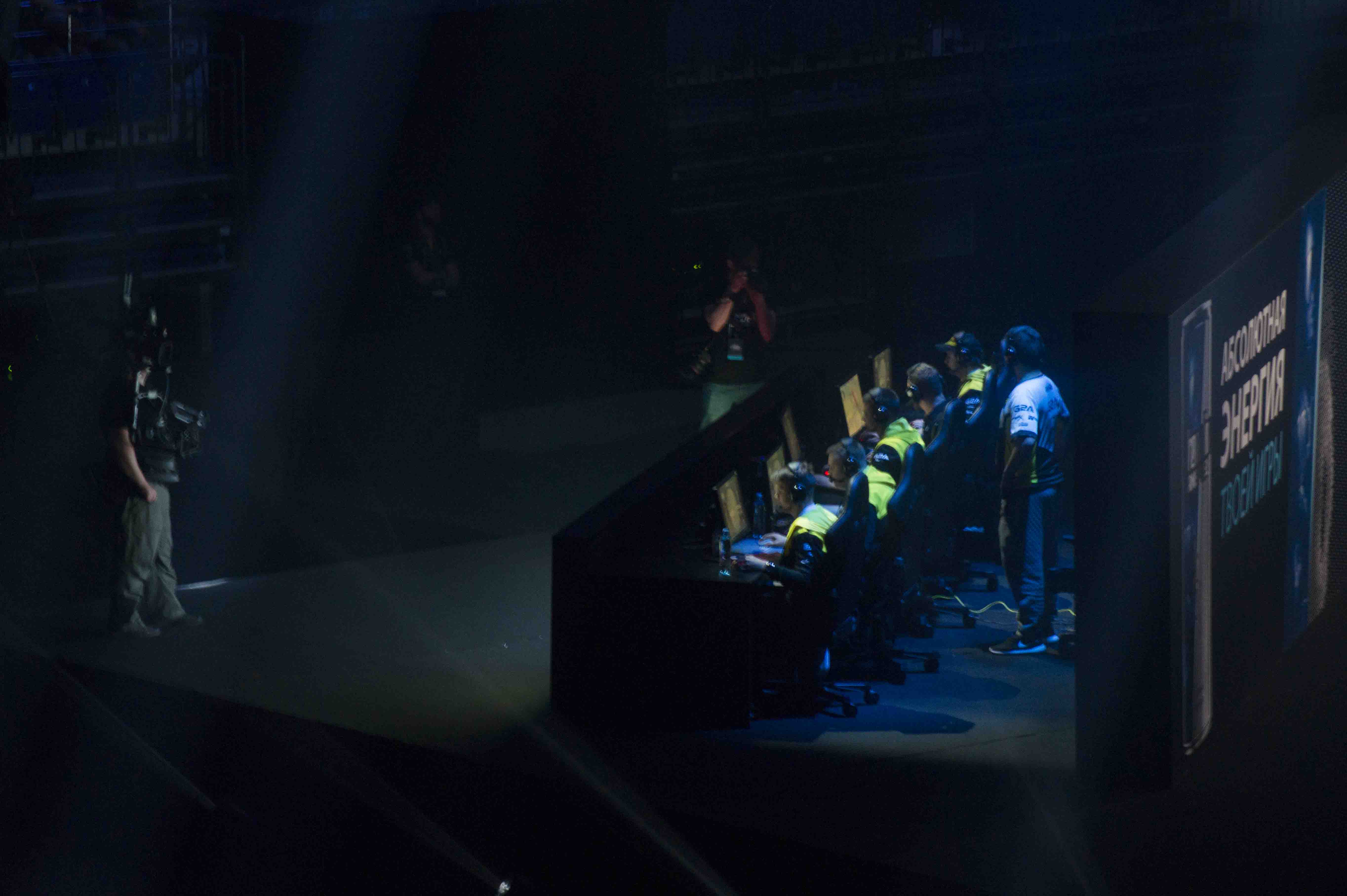 Арена для состязаний — классическая для кибер-спорта. Яркое точечное освещение игроков, полумрак в зале и иногда пробегающие лучи золотого и фиолетового цвета по залу. Команды сидели в разных углах на квадратной возвышенности спинами друг к другу.