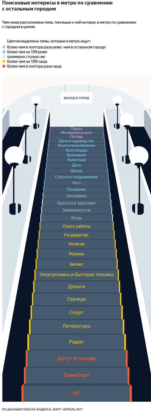 Ежедневно из московского метро поступает примерно 300 тыс. поисковых запросов. Авторы исследования проанализировали 18,5 млн запросов и сравнили результаты с 16,4 млн случайных запросов по всей Москве. Самая популярная тема для поиска — информационные технологии. Сюда относятся все, что связано с компьютерами и программированием. В «Яндексе» считают, что люди, связанные с IT-сферой, даже в метро привыкли работать и учиться. Также в метро чаще, чем в городе, ищут информацию про транспорт и досуг. Меньше всего пользователей в подземке интересует порно, интимные услуги, погода, садоводство, кино и кроссворды.