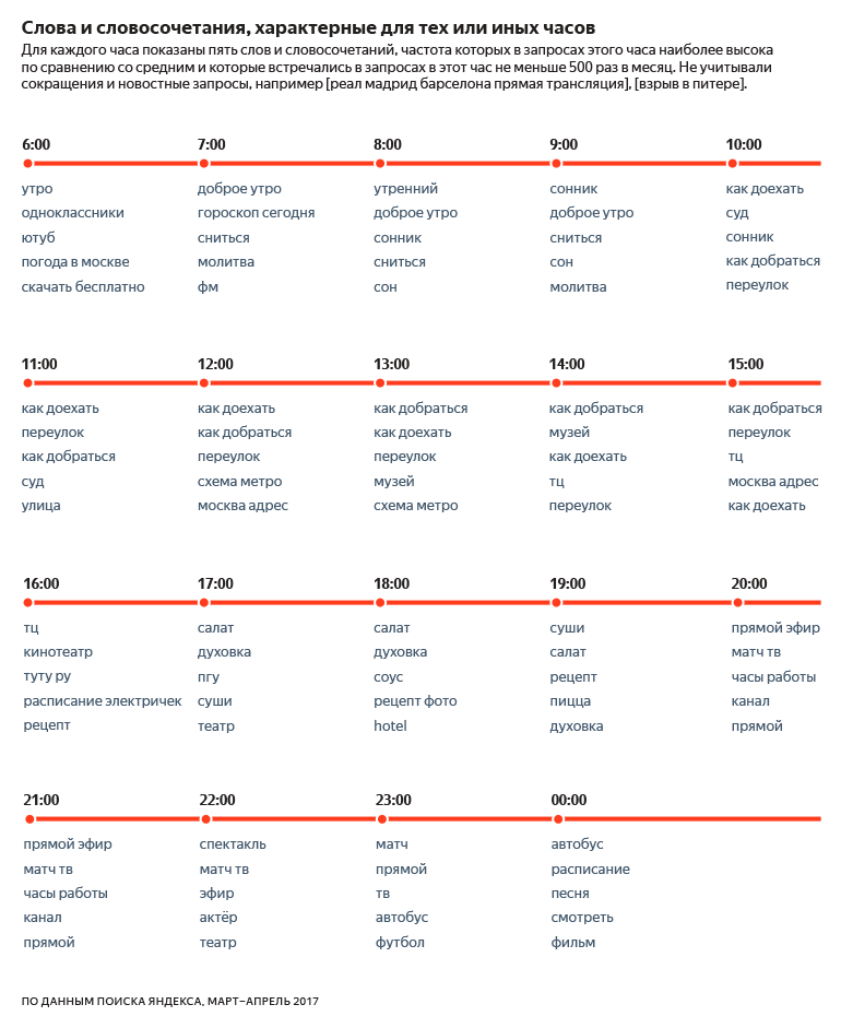 В конце рабочего дня пассажиры мысленно готовятся к ужину, запрашивая у поисковика рецепты блюд. С 20:00 до 23:00 — время любителей футбола и театра. А к самому закрытию метро преобладают запросы о расписании автобусов.