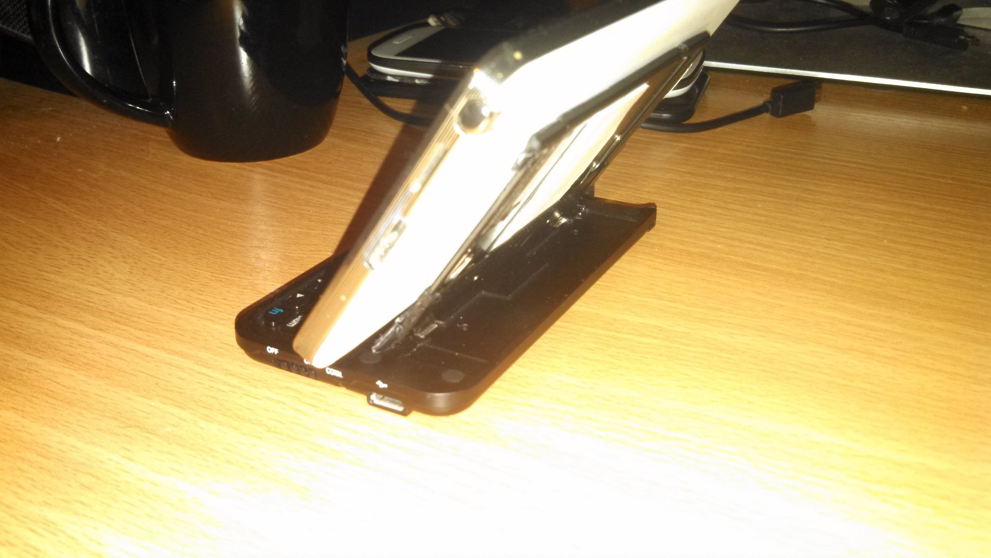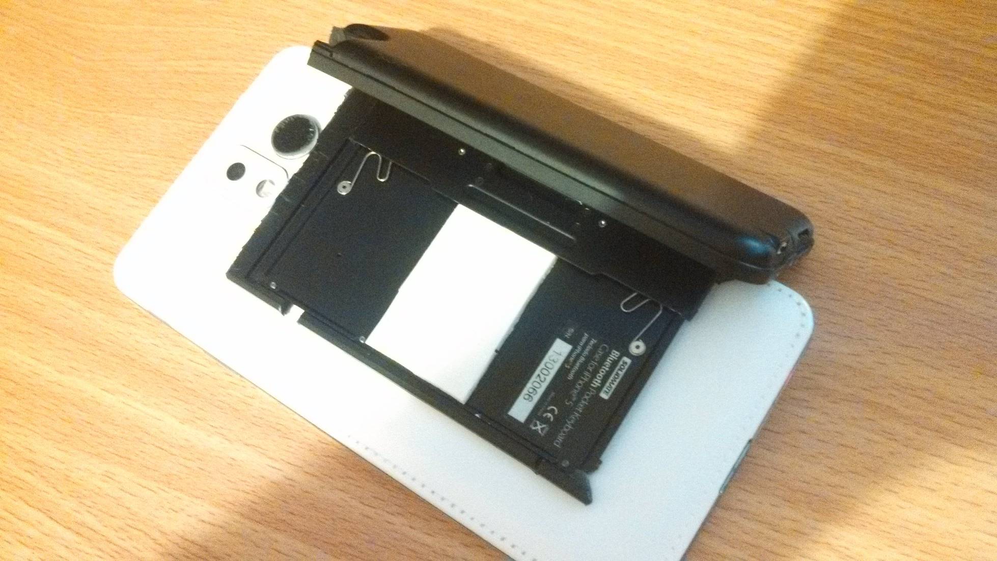 В процессе такого «скрещивания» автору пришлось обрезать верхний край корпуса клавиатуры, чтобы был доступ к камере и прикрепить ее двусторонним скотчем. В остальном, аппарат соединяется с клавиатурой легко, она автоматически выключается при закрытии и включается при открытии. А кроме того, может использоваться в качестве подставки.