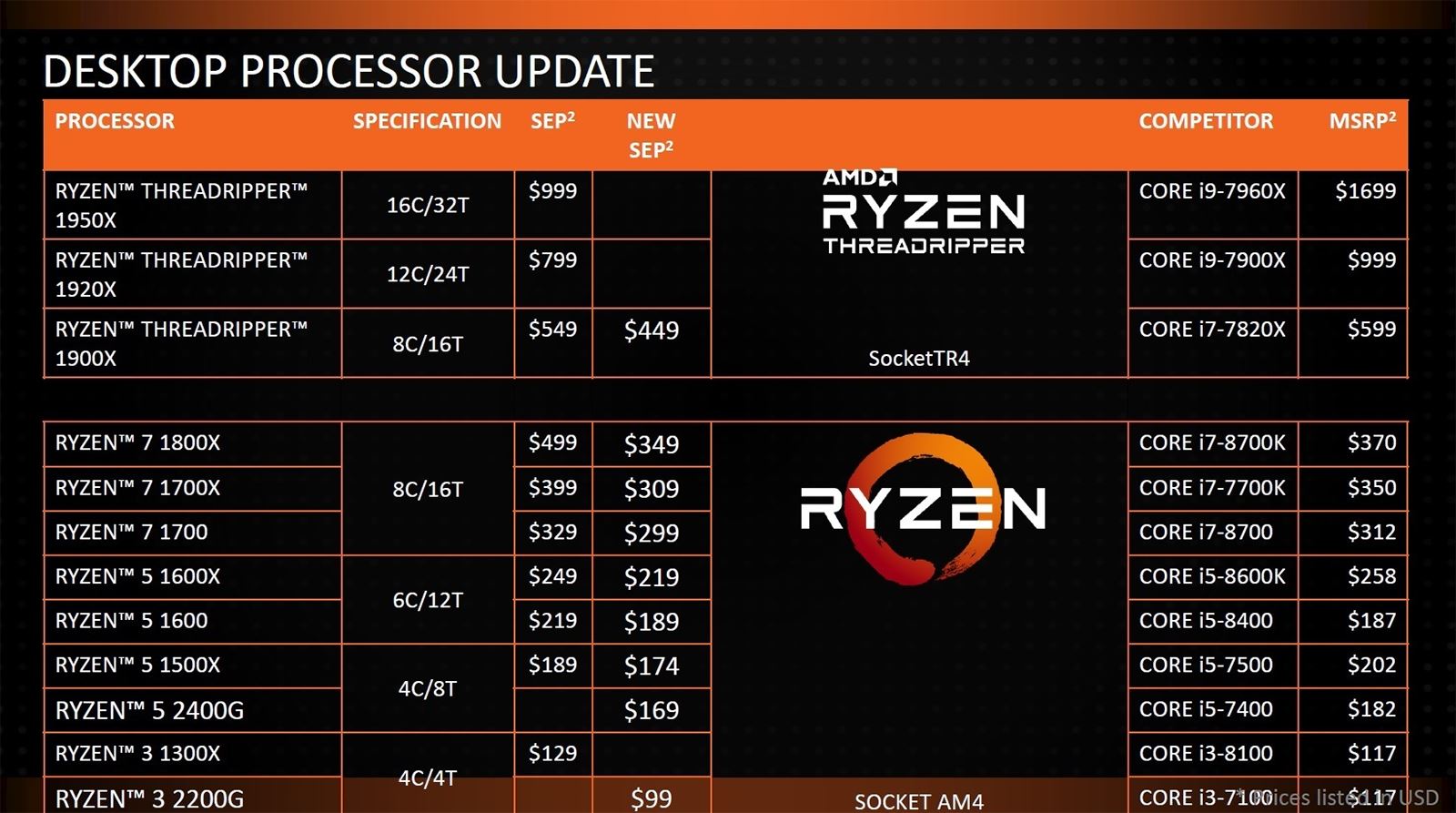 Ценовые изменения затронут ряд процессоров линеек Ryzen Threadripper, Ryzen 7 и Ryzen 5, правда не все. Так, например, Ryzen Threadripper 1900X будет стоить $449 вместо $549. Больше всего подешевеет Ryzen 7 1800X, теперешняя его цена составит $349 вместо $499. Меньше всего сбросили цену шестиядерники Ryzen 5.