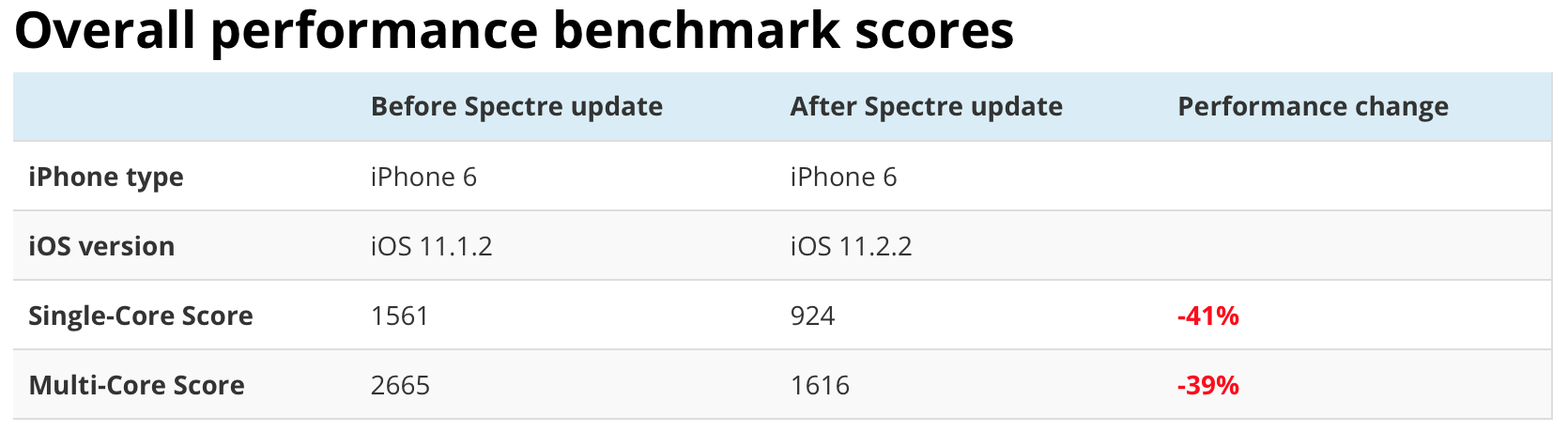 Мелвин Мугхал (Melvin Mughal), основатель нескольких популярных стартапов, опубликовал в своем блоге результаты сравнения производительности iPhone 6 до и после установки обновления iOS 11.2.2. Согласно предоставленным им данным, новая версия операционной системы снизила производительность его смартфона на 41% и 39% в одноядерном и многоядерном тестах соответственно (скриншот результатов доступен выше).