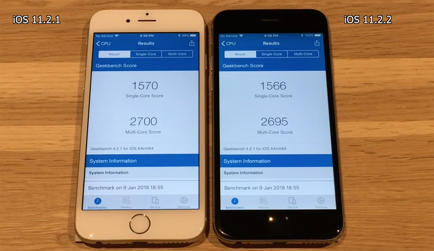 Судя по многочисленным отзывам владельцев iPhone 6 на различных форумах, производительность данного смартфона (и других моделей) не снизилась после обновления до iOS 11.2.2. Как видно на видеозаписи сравнения скорости работы iPhone 6 под управлением iOS 11.2.1 и iOS 11.2.2 (в конце ролика автор канала iAppleBytes тестирует смартфоны в бенчмарках), производительность гаджетов практически идентична — падения производительности на 40% точно нет.