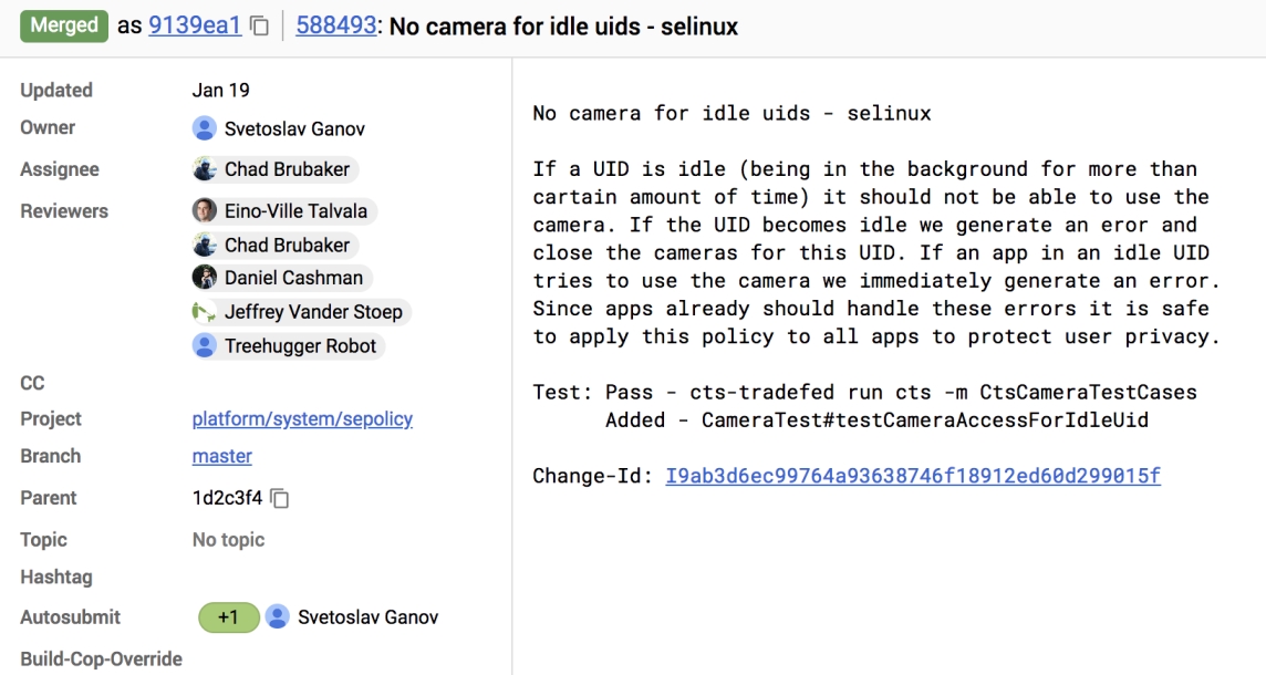 Сообщается, что в Android P появится функция, блокирующая доступ программам к камере, когда они находятся в спящем режиме (Doze). Правила будут автоматически применяться в соответствии с уникальным идентификатором приложения (UID), который назначается при его установке. Это уменьшит вероятность использования камеры смартфона или планшета вредоносными приложениями.