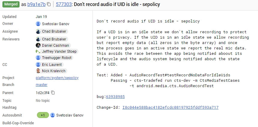 Помимо блокировки доступа к камере, разработчики XDA Developers нашли упоминание об ещё одной функции, предотвращающей фоновый доступ приложениям к микрофону. Ранее было неоднократно доказано, что любая программа, которая получила разрешение на доступ к микрофону, может в тайне от пользователя записывать в фоновом режиме всё, что происходит вокруг. Функция будет работать следующим образом. Когда приложение уходит в режим Doze, во время записи оно добавляет строку с нулями в массив байтов. После возвращения в активное состояние, программа начинает записывать в файл реальные данные.