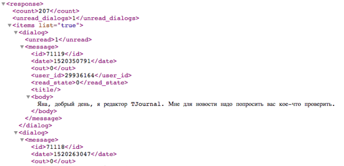Yoga2016 хотел собрать аналитику во «ВКонтакте», но вместо этого получил ссылки на приватные сообщения 300 случайных пользователей социальной сети. Чтобы их просмотреть разработчик добавил в строчке с адресом «.xml». Кроме текстовых сообщений, в полученной информации по ссылке также можно найти фотографии, id-номера страниц и другие данные пользователей.