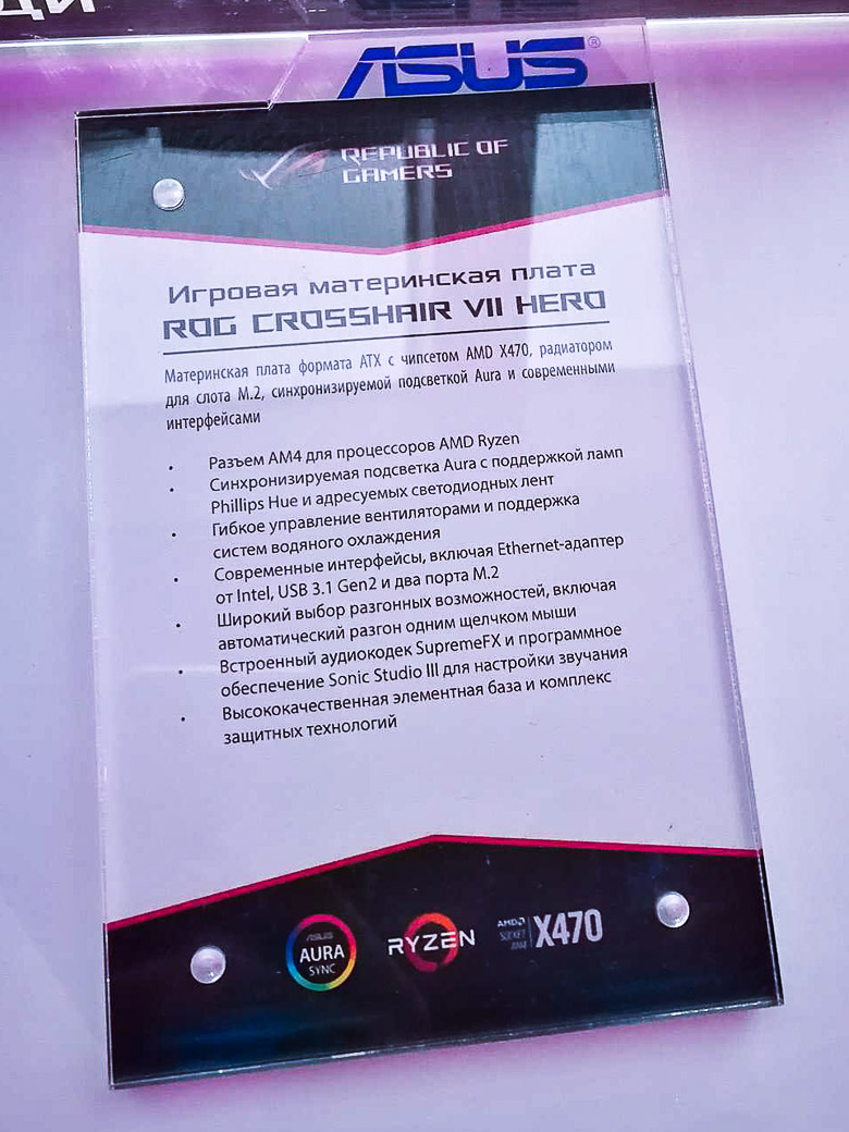 Линейка новых плат состоит из нескольких позиций, и возглавляет её топовая модель ROG Crosshair VII Hero (+ версия с модулем Wi-Fi), созданная, в первую очередь, для оверклокеров, геймеров и компьютерных энтузиастов в широком смысле слова. Strix X470-F Gaming, как понятно из названия, оптимальна для поклонников игр и позволяет получить передовые возможности настройки и персонализации за разумные деньги, а плата Strix X470-I Gaming в компактном форм-факторе mini-ITX позволяет добиться тех же результатов для компактной системы.