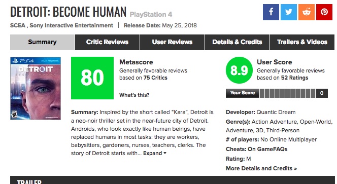 В итоге, оценки критиков и пользователей вылились в 80 баллов на Metacritic, а профильные ресурсы ставят новинке 8 из 10 баллов. Как мы и ожидали, Detroit: Become Human хвалят за серьёзную драматургию, три совершенно разные сюжетные линии, эмоциональные кат-сцены и атмосферный виртуальный мир. Геймплейная составляющая при этом хромает на обе ноги, но эксклюзивы на PS4 покупают не ради стрельбы и прыжков через заборы, для этого есть Battlefield и прочие подобные проекты. Здесь же геймеру расскажут угрюмую историю о мире будущего, где люди проигрывают битву за эволюцию.