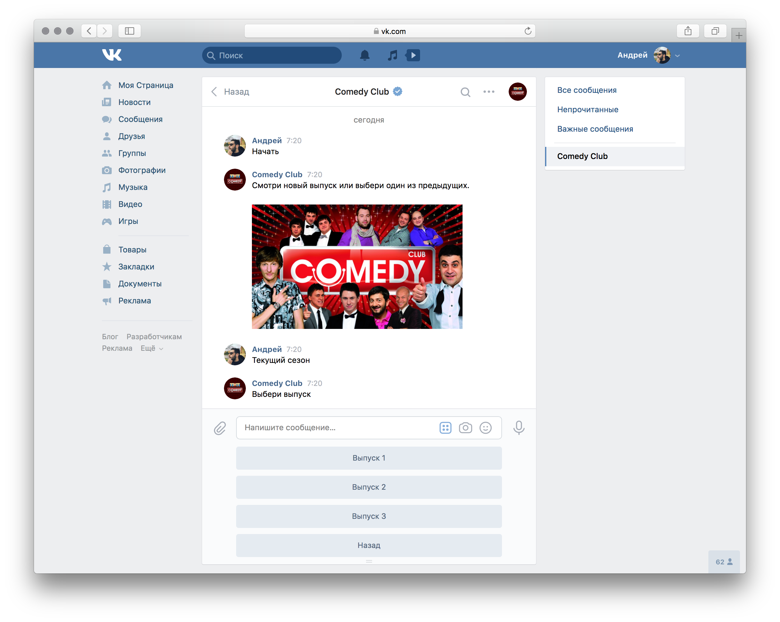 Новую функцию протестировали официальные сообщества Comedy Club, «Бот Максим» и Callback API Бот. Например, с помощью бота Comedy Club пользователи могут быстро найти нужный выпуск юмористического шоу: необходимо выбрать сезон и номер выпуска, чтобы посмотреть его прямо в окне чата. Также попробовать чат-ботов с кнопками в настоящее время можно в сообществах «Бот Максим» (преобразует текст в аудиосообщение) и Callback API Бот (сообщает о событиях сообщества).