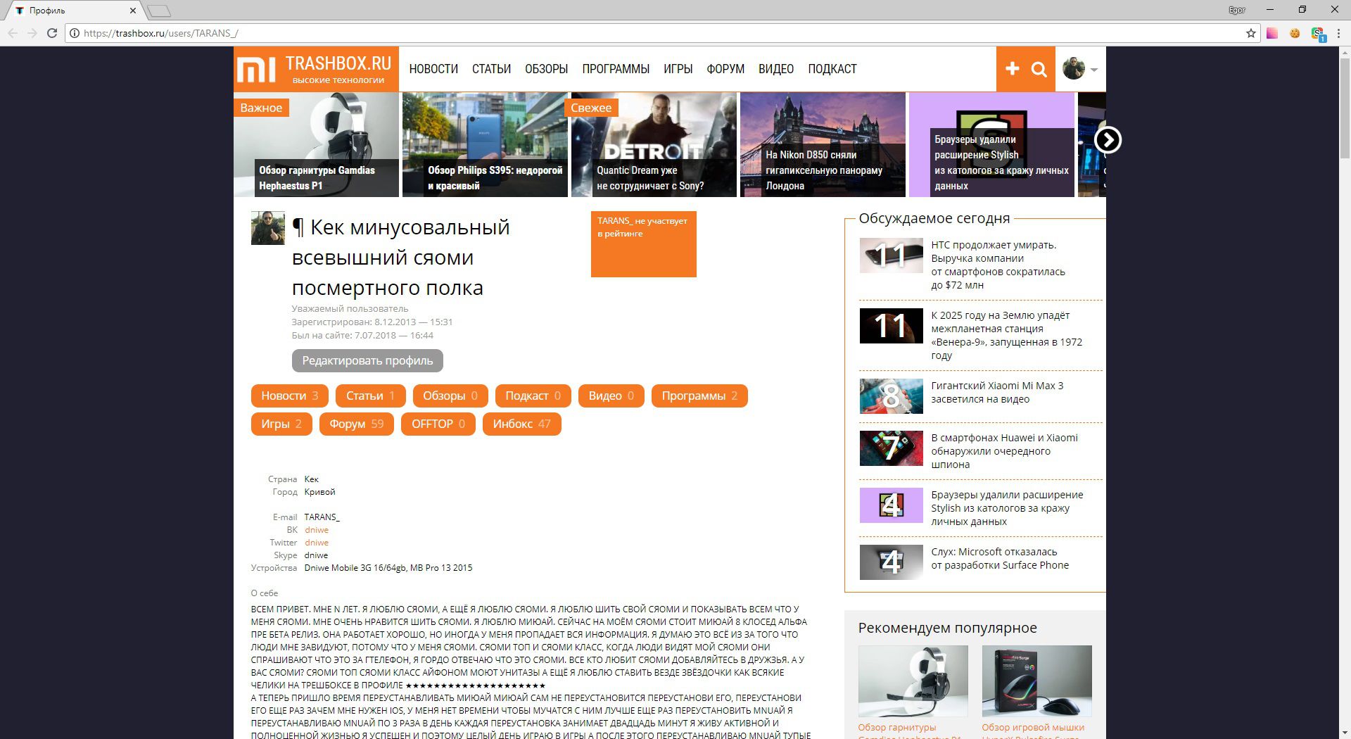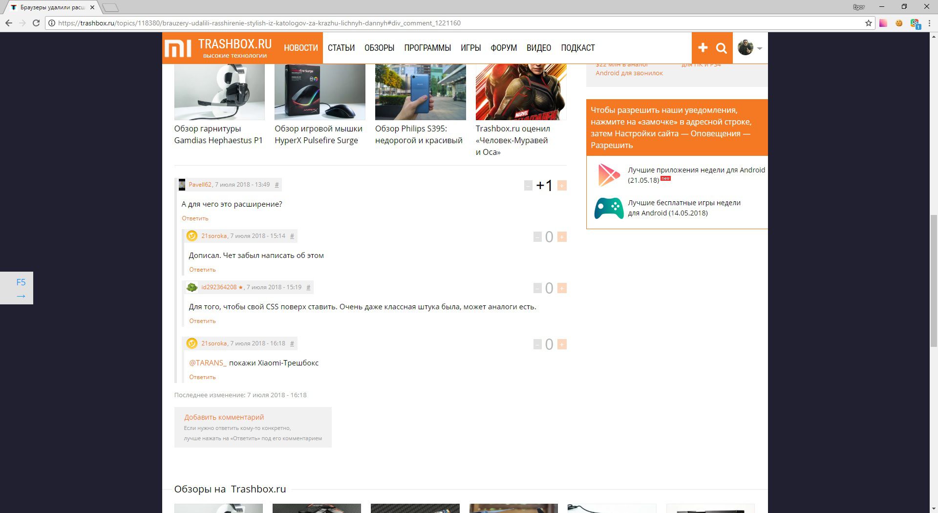 Stylish и Stylus — самые популярные браузерные расширения, позволяющие изменять интерфейсы отдельных сайтов. С помощью них пользователи могут изменять акцентный цвет веб-страниц, удалять или редактировать ненужные элементы, вручную создавать тёмные темы сайтов и подобное. Главное — знать основы веб-программирования (язык разметки HTML и CSS). Некоторые читатели Trashbox.ru используют подобные расширения для изменения даже нашего портала (скриншоты выше от пользователя под ником @TARANS_).