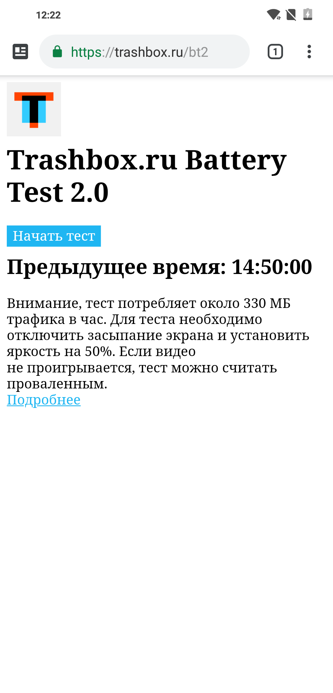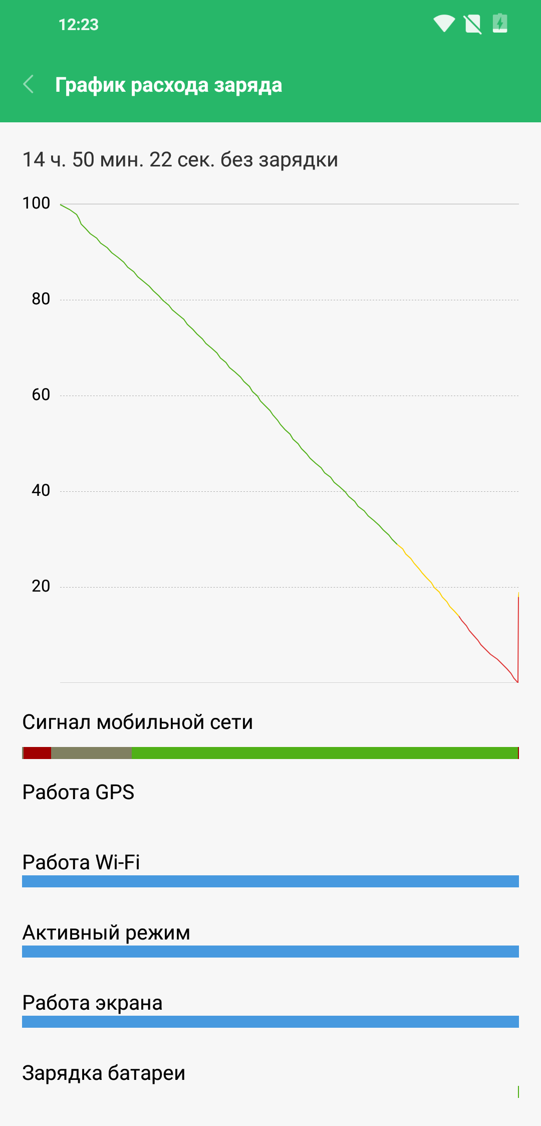 В фирменном тесте батареи Trashbox.ru Pocophone F1 с яркостью экрана на уровне 50% проработал без зарядки ровно 14 часов и 50 минут. Как можно заметить на скриншоте, график расхода заряда равномерный — перебои в использовании аккумулятора отсутствуют. Смартфон поддерживает быструю зарядку Quick Charge 4.0, но в комплекте поставляется адаптер питания Quick Charge 3.0 (вход 100-240 В на 0,5 А, выход 5 В на 1,5 А / 9 В на 2 А / 12 В на 1,5 А). Для сравнения: Vivo NEX, работающий на базе того же Snapdragon 845 и имеющий аналогичную емкость аккумулятора (4 000 мАч), показал другие результаты — 14 часов 35 минут.