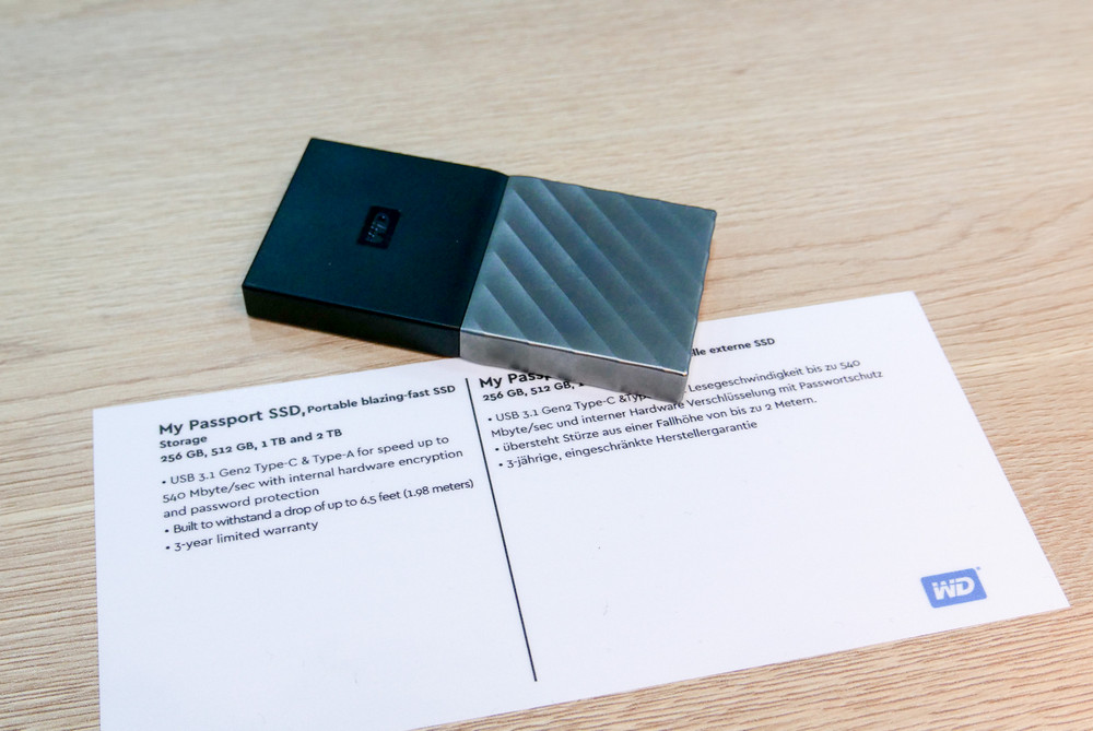 Диски входят в линейку My Passport и обладают рядом уникальных особенностей. SSD облачен в стильный корпус из пластика и металла. По заявлению инженеров Western Digital, конструкция накопителя выдерживает падения с высоты до двух метров. Более того, компания предоставляет гарантию сроком на три года. Устройство оборудовано входом USB Type-C (USB 3.1 второго поколения), способным пропускать информацию со скоростью до 540 Мбайт в секунду. В комплекте с диском идет кабель-переходник на классический USB Type-A, поддерживающий также стандарты USB 2.0 и 3.0. Western Digital My Passport выпускается в четырех модификациях: на 256 ГБ, 512 ГБ, 1 ТБ и 2ТБ. Также SSD может похвастаться встроенной технологией WD Backup для резервного копирования данных в фирменном облаке.