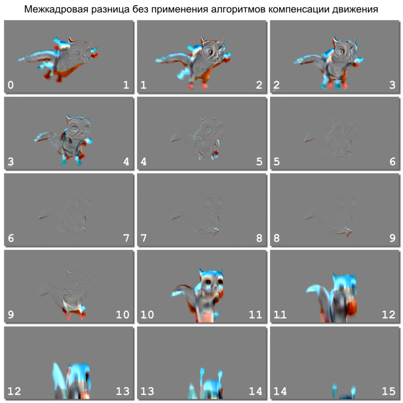 Прежде всего, кадры делятся на равные блоки, и между ними идет процесс поиска схожих блоков на другом кадре, так компьютер выстраивает поле движения векторов. При самой компенсации учитываются все вектора движений и идет процесс генерации изображения, похожего на исходный (предыдущий) кадр.