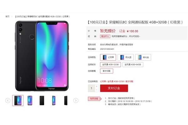 Новый смартфон Huawei будет доступен в четырёх расцветках: чёрной, синей, золотой и пурпурной. Стоимость новинки не уточняется. Но если учесть, что Honor 8X стоит от 1399 юаней (около $202), то можно предположить, что Honor 8C поступит в продажу по цене около 999 юаней ($145).
