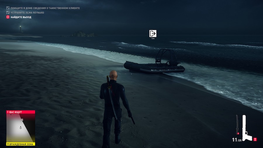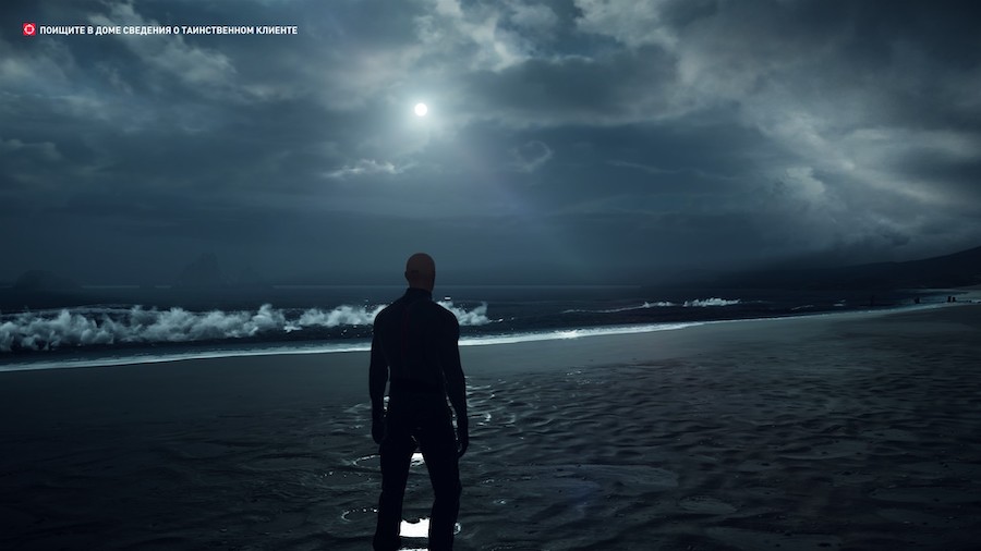 Дизайнеры уровней потрудились на славу, это видно даже в самой первой локации, которая выступает неким обучающим полигоном. У нас есть пляж, заросли травы (они ещё пригодятся) и жилище, которое нам нужно изучить. Это самая первая глава в новой истории, на её прохождение уходит буквально тридцать минут, но и над ней разработчики очень плотно поработали. Например, на песку остаются отпечатки нашей обуви, луна светит очень реалистично, а водная гладь выглядит крайне привлекательно. Особняк цели тоже проработан до мельчайших деталей — внутри разбросаны вещи, стоят бокалы с вином, колышутся шторы у открытого окна.