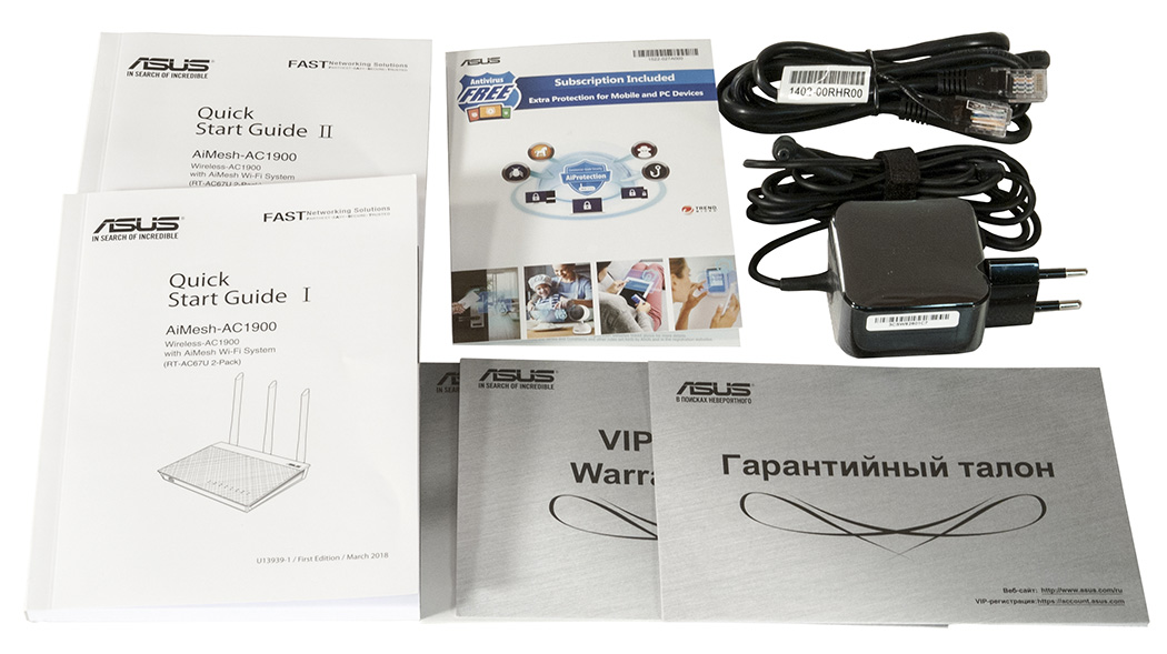 Комплект поставки включает в себя адаптер питания и сетевой кабель Ethernet. Кроме этих необходимых ингредиентов присутствует и целый ворох бумаг, а именно: два руководства пользователя (русский язык в первом томе), гарантийный талон и листок с информацией о подписке на антивирус Trend Micro сроком 1 год. Антивирус включает в себя утилиту Mobile Security для двух мобильных гаджетов и приложение Antivirus+ Security для двух компьютеров с Windows. Активировать антивирус можно на страничке продукта.