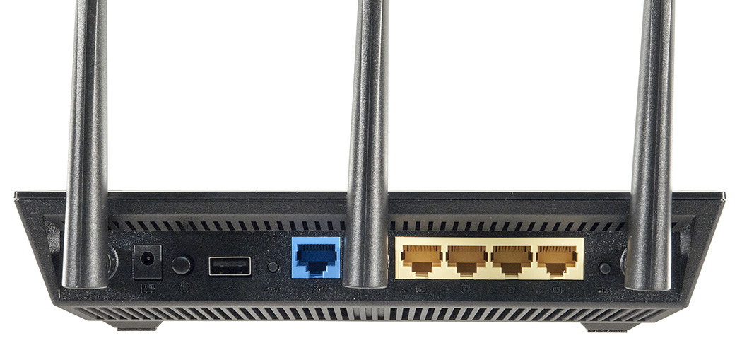 Тыльная сторона самая богатая. Здесь находятся три внешние несъемные антенны с возможным наклоном в 90° и вращением вокруг своей оси на 180°. Также тут размещены проводные интерфейсы — гигабитный WAN-порт синего цвета и 4 гигабитных LAN-порта желтого цвета. Для подключения периферии (внешние накопители, принтеры и модемы) имеется еще один порт USB, который поддерживает спецификацию USB 2.0. Кроме того, на задней панели находится клавиша включения/выключения, кнопка сброса на заводские настройки, разъем для адаптера питания и кнопка WPS для быстрого подключения беспроводных устройств.