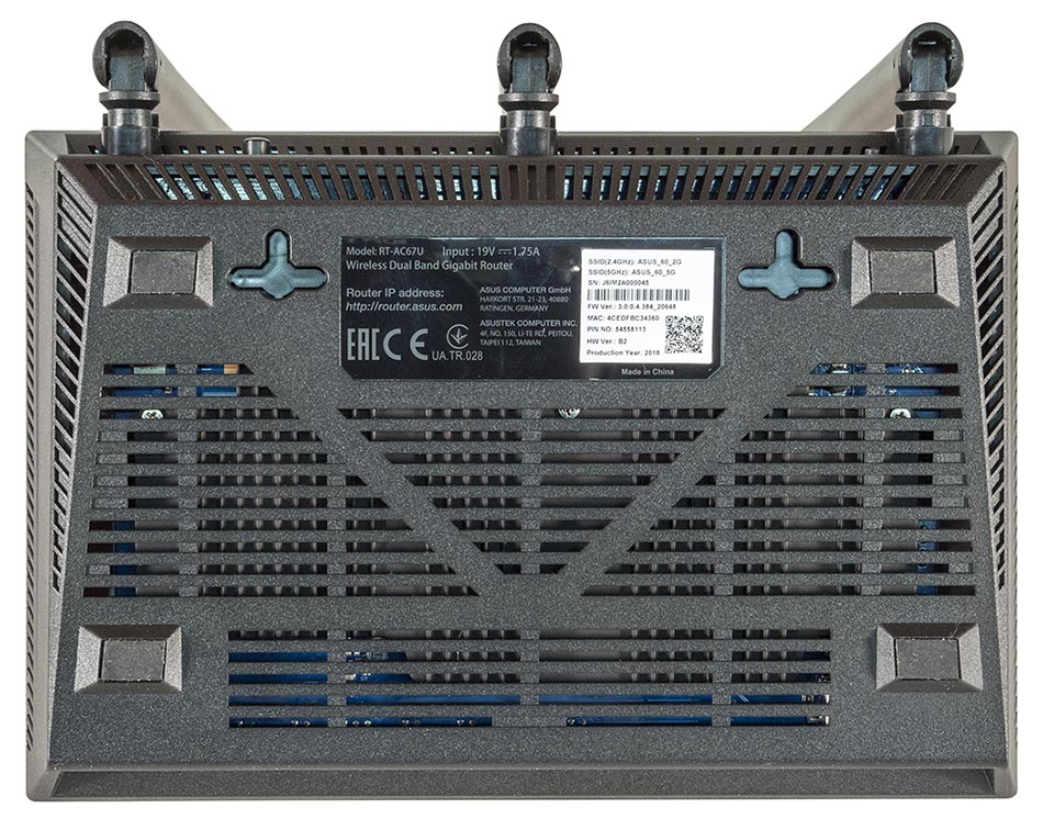 Поскольку ASUS RT-AC67U устанавливается горизонтально, он имеет четыре прорезиненные ножки на основании. Там же имеется небольшая наклейка с данными о модели, штрихкод и QR-код модели. За счет двух небольших отверстий имеется возможность горизонтального крепления на стену.