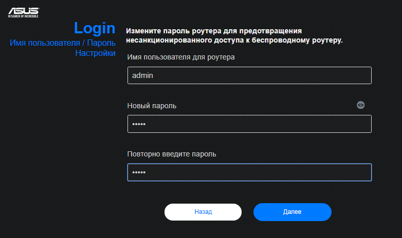 Затем нам предлагают установить логин и пароль для входа в меню администрирования.