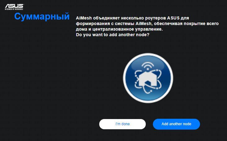 После этого появится окно в котором нам предложат добавить еще один опорный узел Mesh-сети, правда в этом случае инсталлятор все равно перейдет на заглавную страницу роутера.