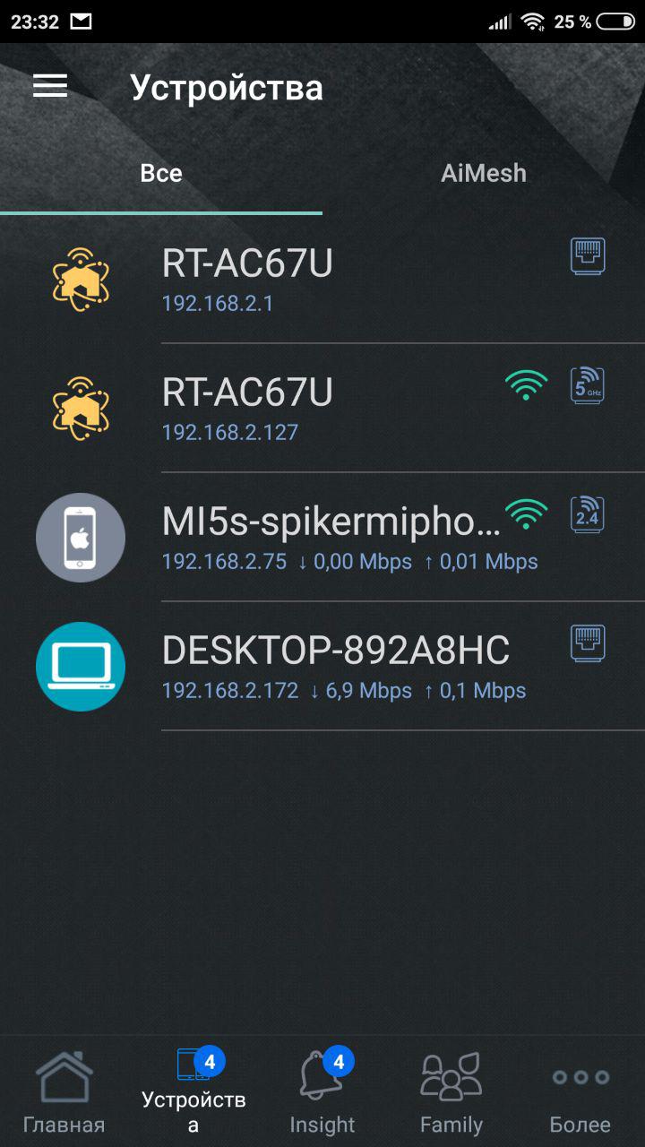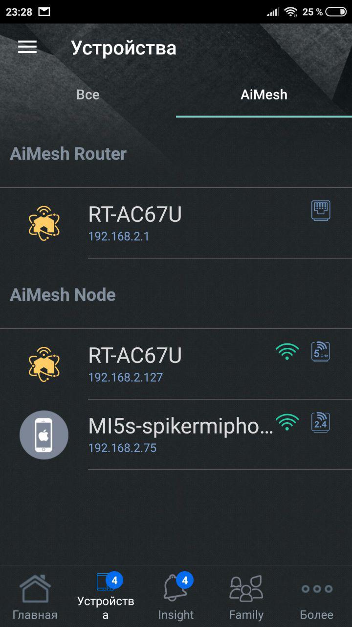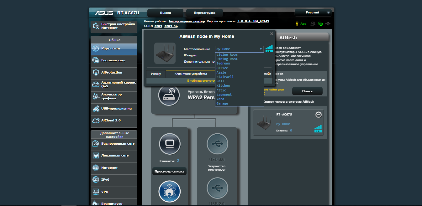Имеется полный список устройств и подключенных узлов AiMesh.